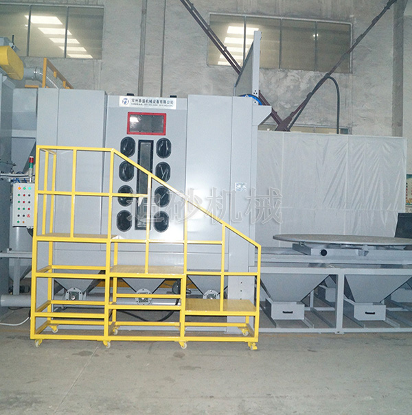 將工件裝夾在轉(zhuǎn)盤,由臺車帶動轉(zhuǎn)盤移動至噴砂加工位,移動到一定位置臺車被限位此時臺車停止移動動(手動),工件由轉(zhuǎn)盤帶動做緩慢旋轉(zhuǎn)(手動),手持噴砂槍對工件表面進行噴砂加工,加工完畢,臺車退出、裝卸工件。